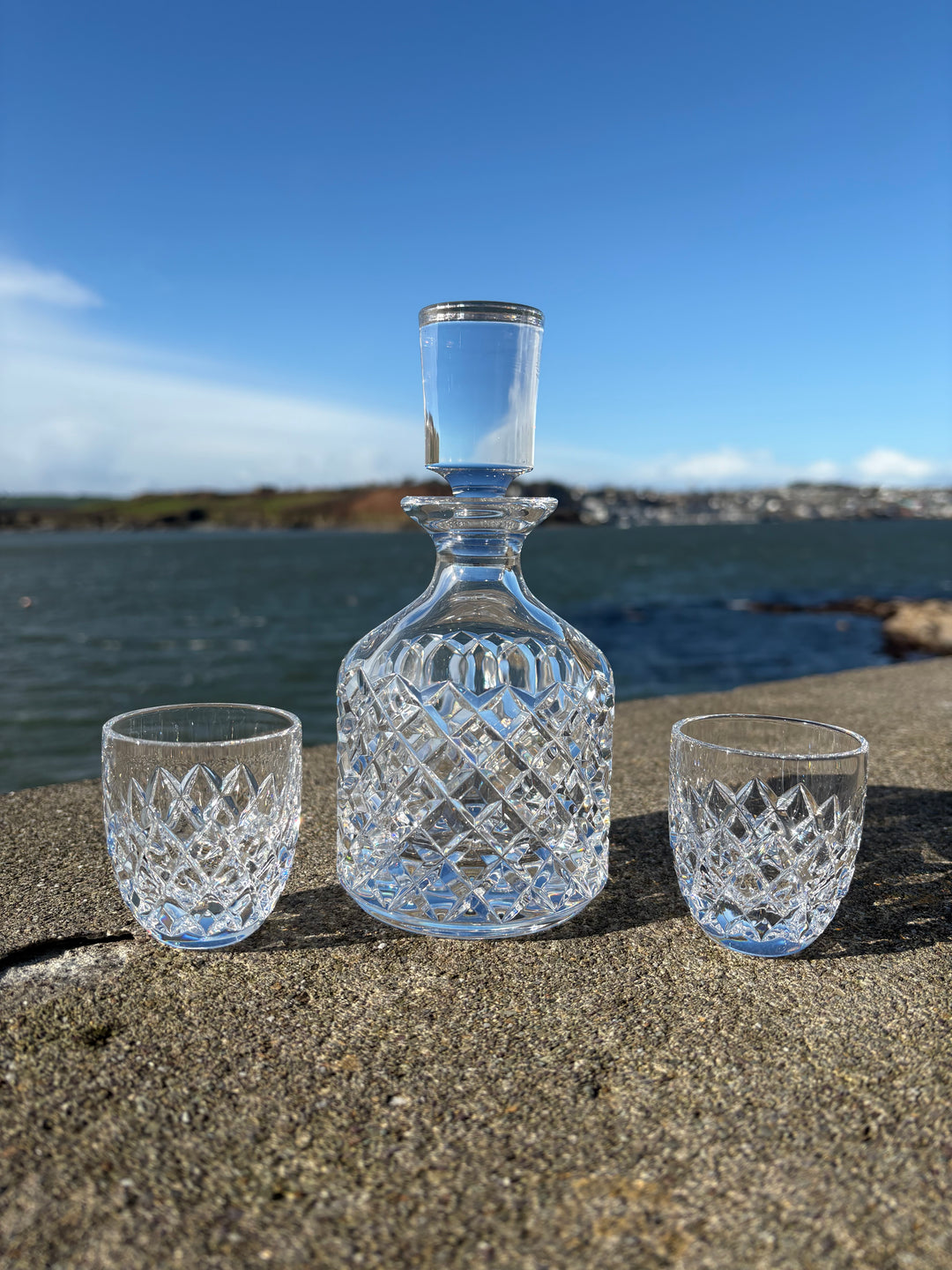 A whiskey decanter and two 10oz old-fashioned tumblers in your choice of pattern; Pineapple, Scilly or Harmony.